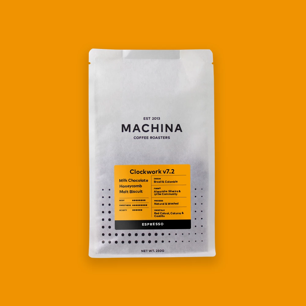 Clockwork is our signature espresso blend. Created to offer a speciality grade blend to those needing a great all-rounder, it’s a versatile and easy to use coffee that can be served black or white in a range of brewing styles. It offers great body and sweetness, but also has a good level of acidity that is not overpowering. It’s sits well as either a classic flat white, an old school moka pot or a Sunday cafetiere.