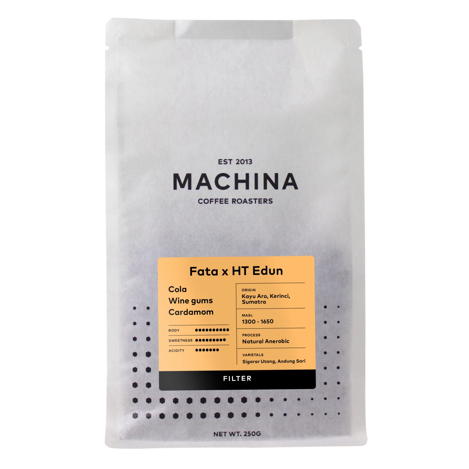 Fata x HT Edun is a truly exceptional coffee. Incredibly rich and textured, layered with flavours of herbaceous cola, syrupy sweet wine gums, with a delicious undercurrent of earth-spicey cardamom. Despite its intense flavours, it manages to remain well-balanced and quite refined. A testament to the people involved in cultivating such a high quality coffee, and experimenting with interesting processes.