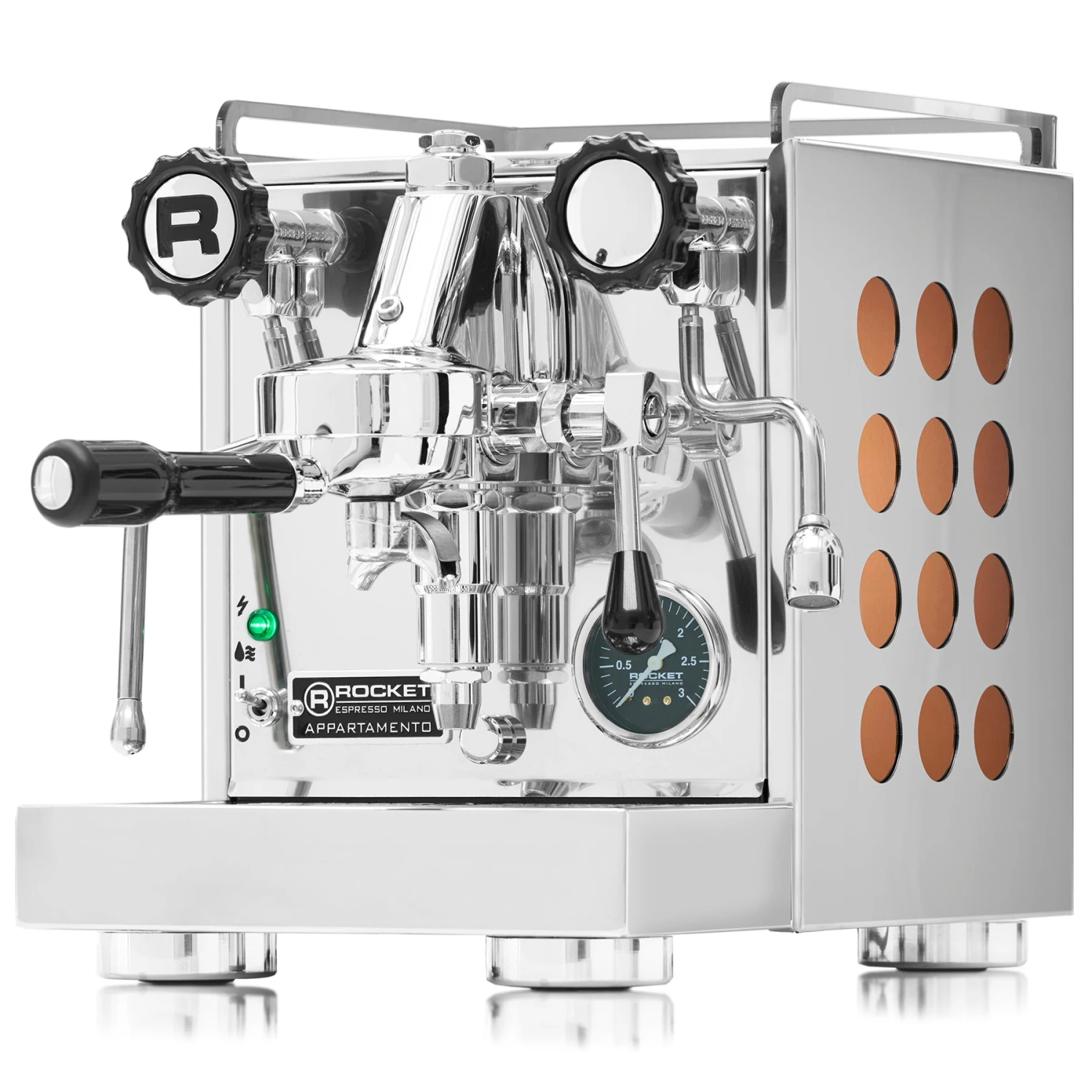 Rocket are the market leader for premium grade domestic espresso machines. The Appartamento V1 HX (Heat Exchanger) is Rocket’s compact domestic machine, geared for use in the home or office, to produce artisan quality coffee. It’s a classic Italian designed espresso machine, constructed from steel and finished in chrome. Rocket machines are known as pro-sumer (commercial grade for domestic use), delivering coffee for domestic use, that’s as close to commercial grade as you will find at this level.