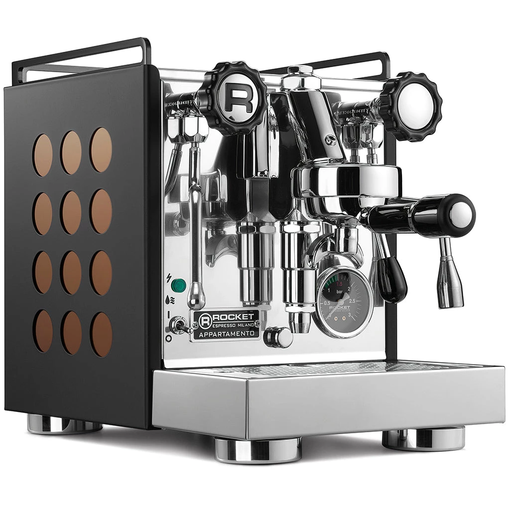 Rocket are the market leader for premium grade domestic espresso machines. The Appartamento V1 HX (Heat Exchanger) is Rocket’s compact domestic machine, geared for use in the home or office, to produce artisan quality coffee. It’s a classic Italian designed espresso machine, constructed from steel and finished in chrome. Rocket machines are known as pro-sumer (commercial grade for domestic use), delivering coffee for domestic use, that’s as close to commercial grade as you will find at this level.