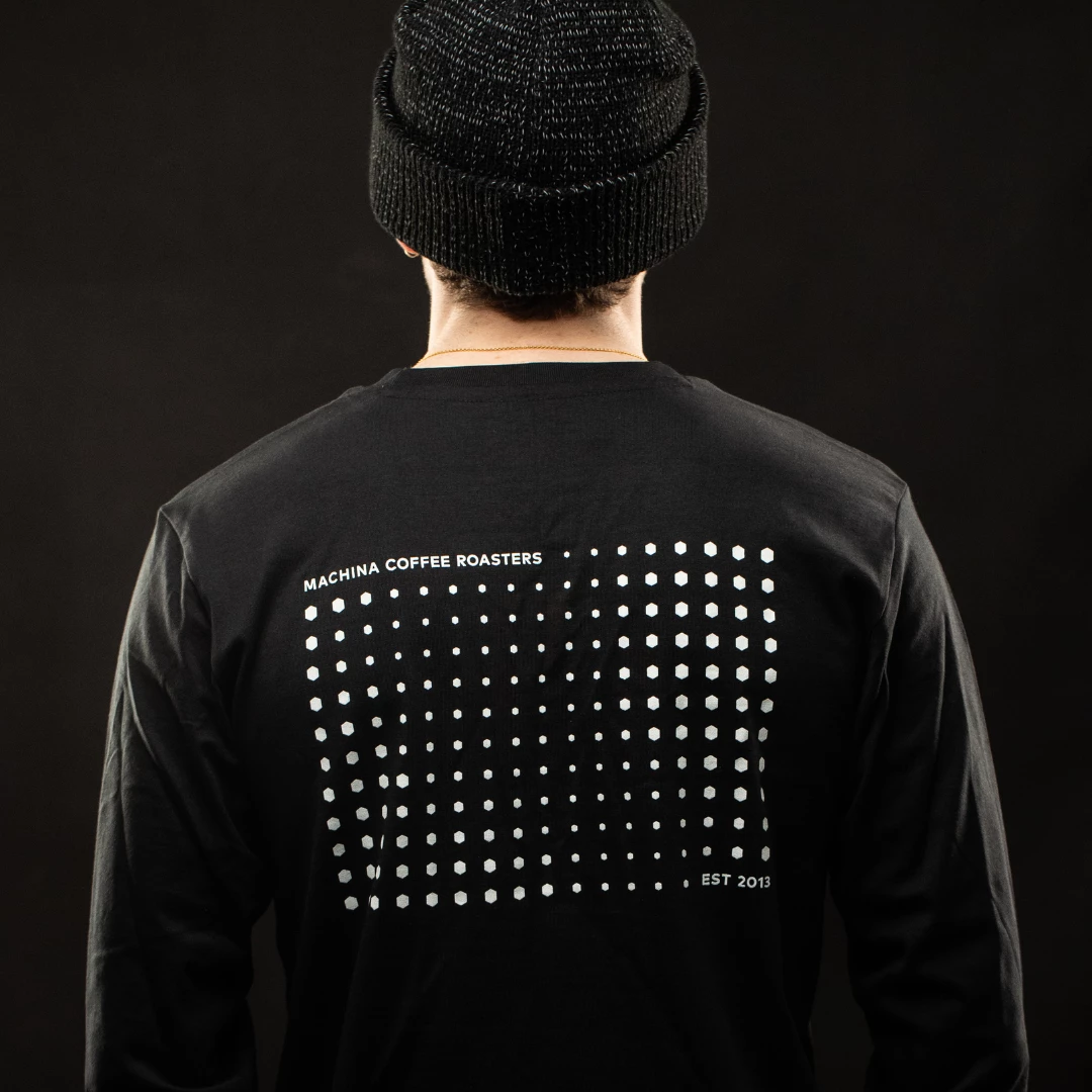 This is our Machina branded Long Sleeve T-Shirt (2021 release). Made from soft organic cotton, these shirts are really nice to wear – soft and well fitted. They come in Small, Medium, Large and X Large. All priced the same.
